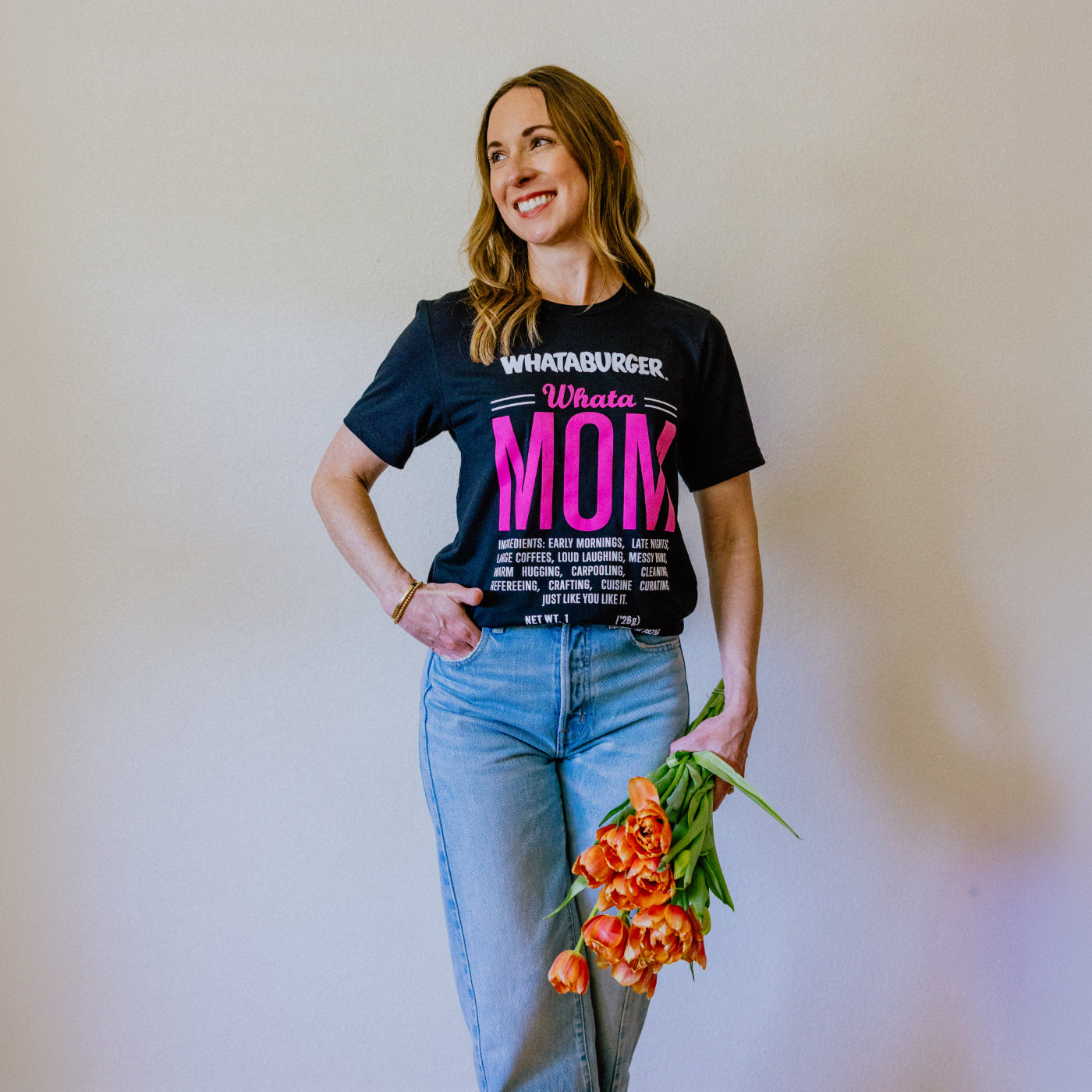 Looking for the perfect gift for mom? Check out our WhataMom Ingredient Black Tee! Inspired by the iconic Whataburger ketchup label design, this tee showcases the essential ingredients of any mom: early mornings, messy buns, crafting, and cuisine curating, to name a few. Get one for the special mom in your life today!