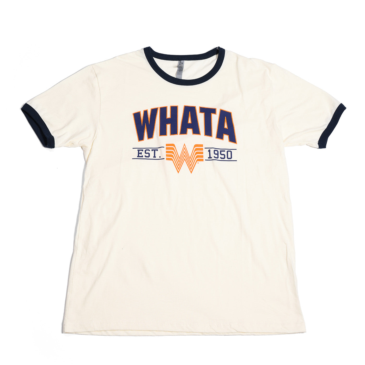 Add a splash of retro charm to your wardrobe with this cream ringer tee featuring navy blue sleeves and neck accents. The bold "WHATA" and "Est 1950" print celebrate the classic spirit with a fun, vintage vibe. Perfect for relaxed days or casual outings, this tee blends comfort and style effortlessly.