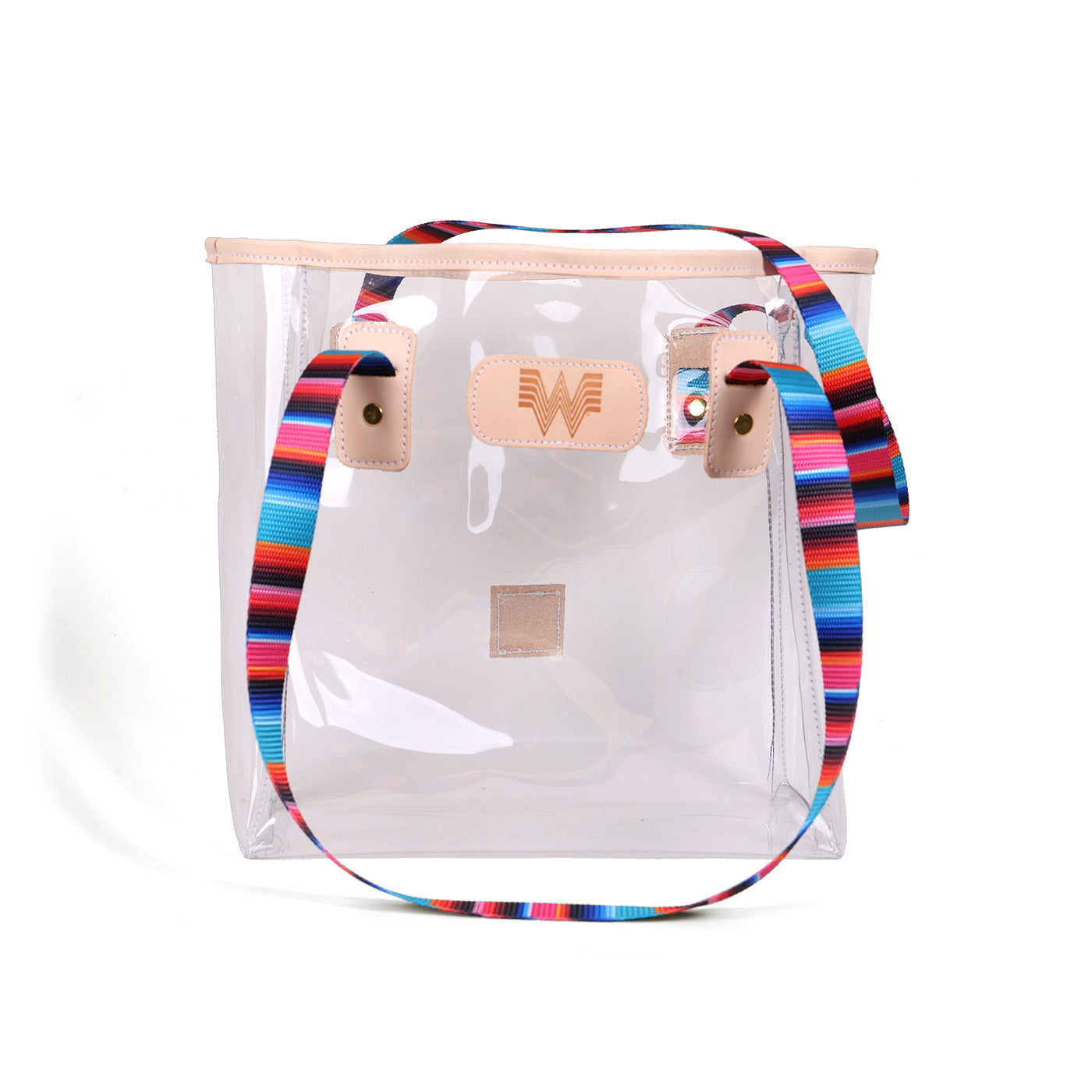 The perfect bag to take on the tour of your life, in a limited-edition Whataburger version. Constructed of clear plastic, trimmed in all-natural leather, with serape webbing handles. This bag is stadium compliant.