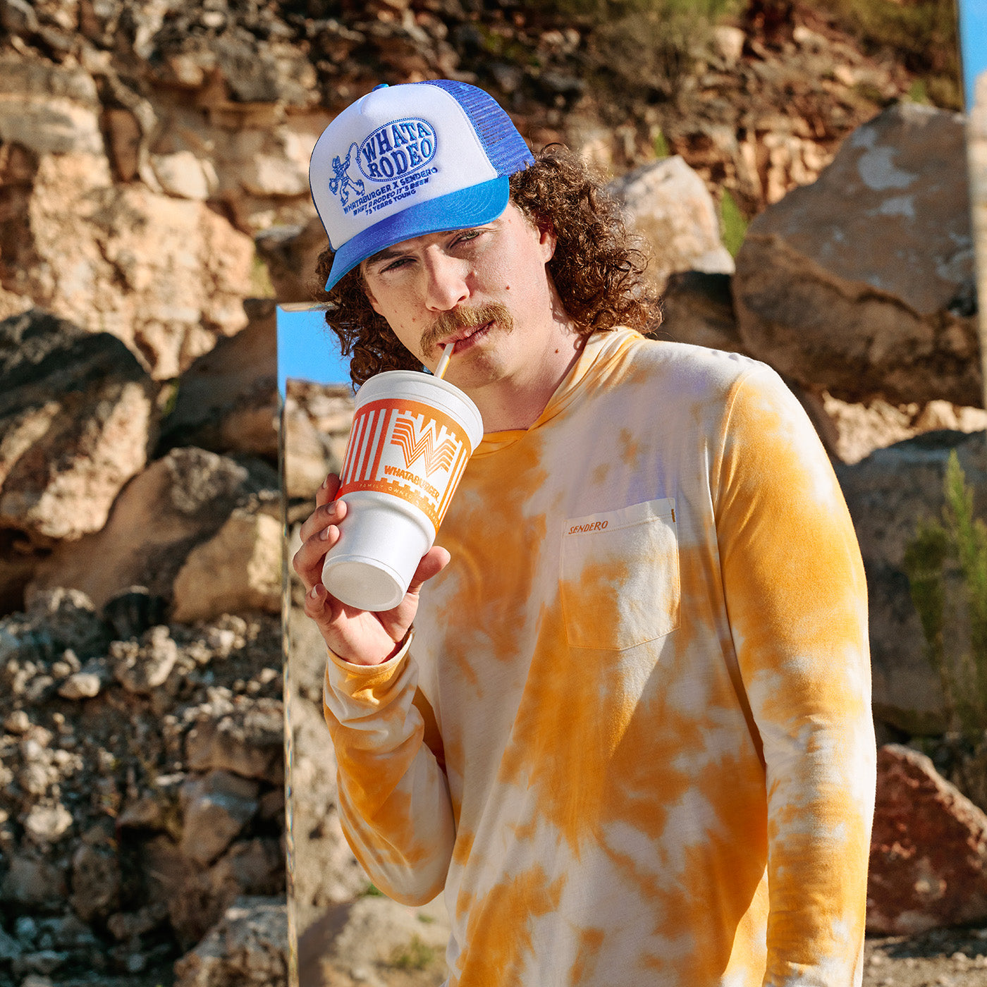 Introducing the limited-edition Sendero x Whataburger collab. Welcome to the 75th Annual Burger Ropin’ Contest. Fastest clean run wins. Clock stops when your tray is empty. Extra marks for triple meat, chocolate shakes, and large french fries. Penalties for stealin’ the table tents, pullin’ the tomatoes off your burger, and not gettin’ all the trash in the bin. Best of luck to ya.