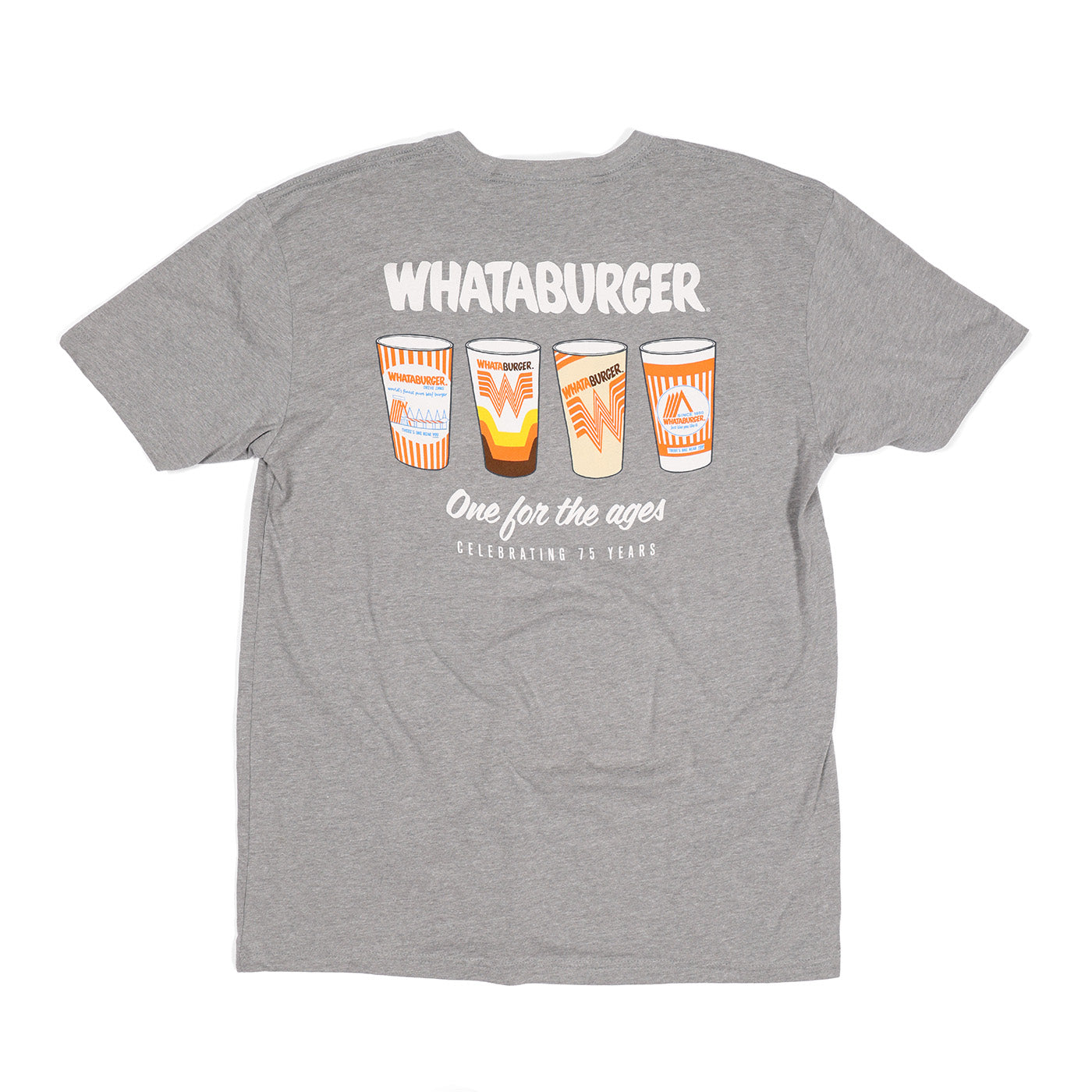 Celebrate 75 years of Whataburger with the Retro Cup Tee! This fun grey tee features "One for the Ages" on the back and showcases four vintage cups representing different Whataburger eras. It’s the perfect playful nod to decades of delicious memories and timeless style.