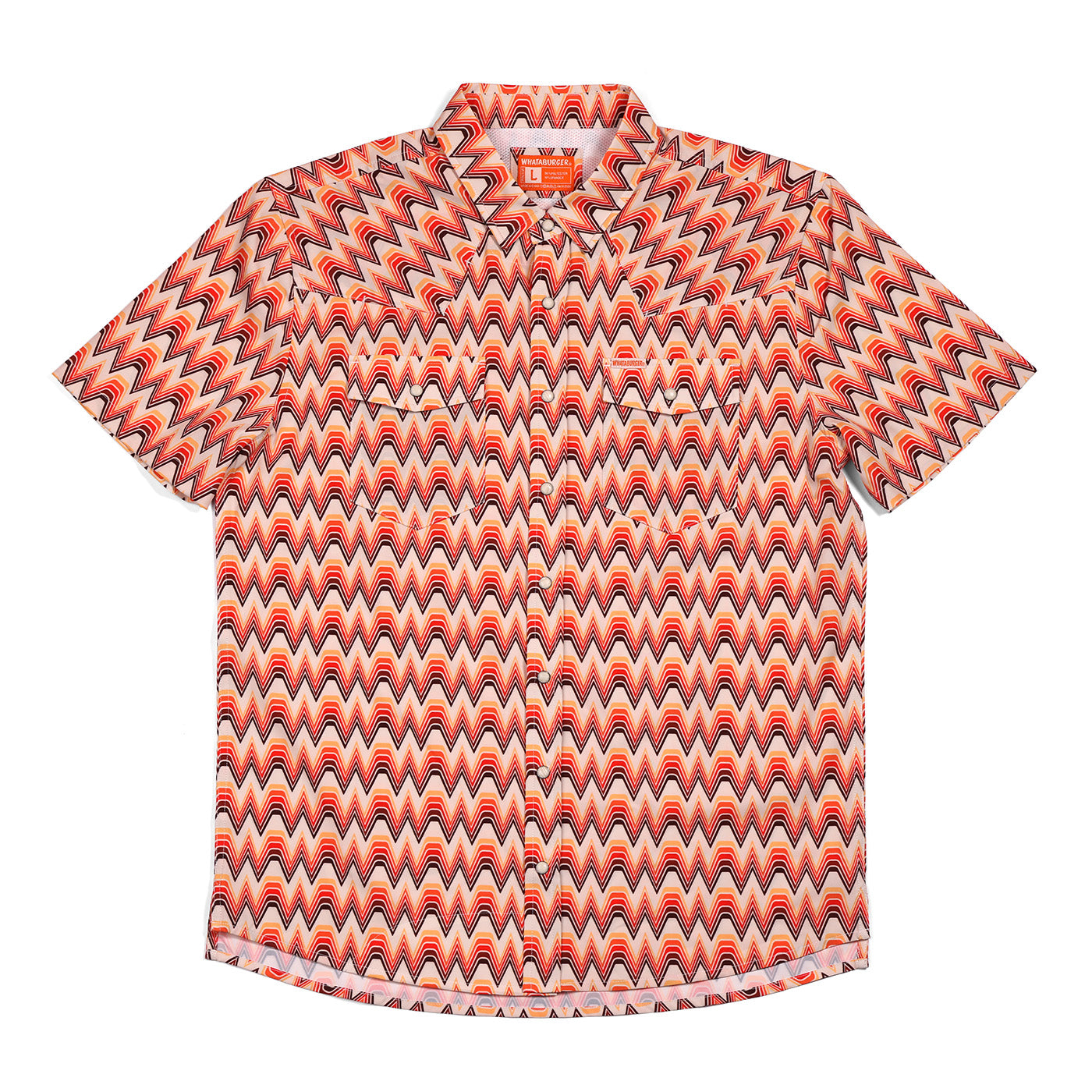 Bring back the groovy vibes with the 70s W Button Up! This lightweight shirt features playful pearl snap buttons and a fun retro pattern of colorful Whataburger logos. Perfect for adding a splash of nostalgia and whimsy to your casual wardrobe.