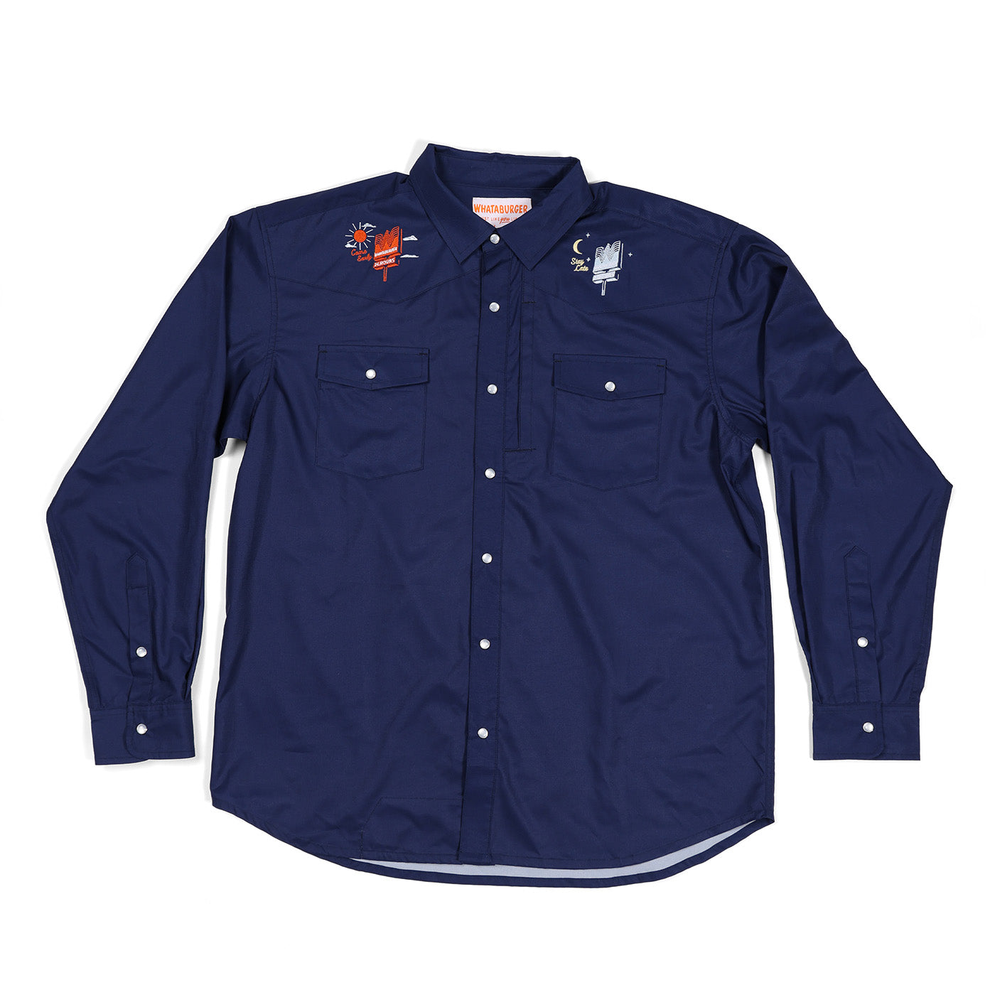 This navy long sleeve button-up shirt features unique designs on each shoulder: "Come Early" with a sunny Whataburger sign on one side, and "Stay Late" with a moonlit Whataburger sign on the other. It’s a playful way to celebrate your Whataburger love from dawn till dusk while staying comfortably stylish.